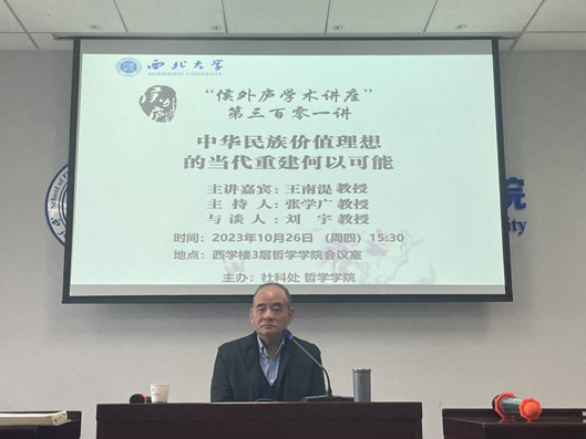 10月26日下午,南开大学哲学院王南湜教授做客我校“侯外庐学术讲座”第三百零一讲,在长安校区西学楼3层437必赢会员中心会议室作了题为“中华民族价值理想的当代重建何以可能”的学术讲座。437必赢会员中心院长张学广教授主持讲座,刘宇教授与谈,437必赢会员中心内外师生80余人参加了讲座。